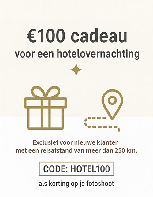 Kies je er toch voor om een shoot in jouw buurt te doen, dan reis ik graag naar je toe. Mijn reiskosten dien je in dat geval ook te vergoeden. Je dient dan wel zelf voor een geschikte locatie te zorgen. Houd er rekening mee dat een hotelshoot altijd een officiële toestemming van de hoteluitbater vereist – het is dus niet toegestaan om enkel een kamer voor een overnachting te boeken.